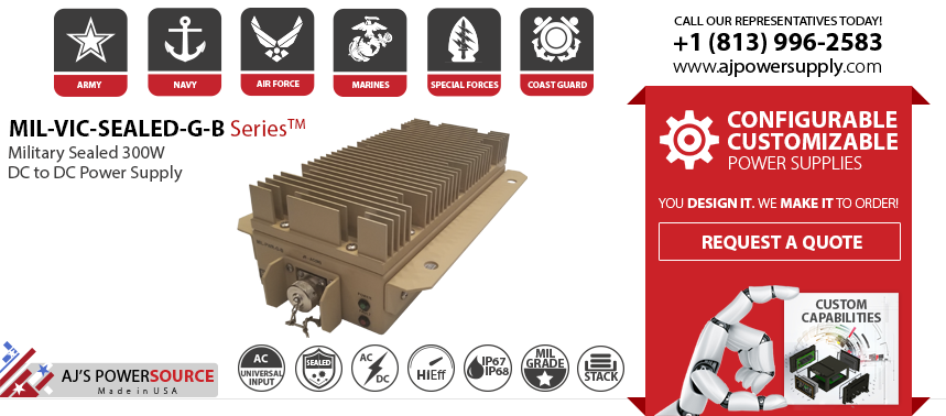 The MIL-VIC-SEALED-G-B from AJ’s Power Source Inc. is an Environmentally Sealed, Military Qualified, Compact, High Efficiency COTS Power Supply designed for use in Critical Applications where dirty/dusty conditions and water ingress is a concern. The IP67 Ingress Protection rating and fanless cooling allows for highly reliable operation under the most adverse conditions. Military Sealed 300W DC DC Power Supply